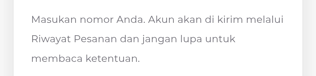 Masukan Nomor anda. Akun anda akan dikirim melalui Riwayat Pesanan dan jangan lupa untuk membaca ketentuan.